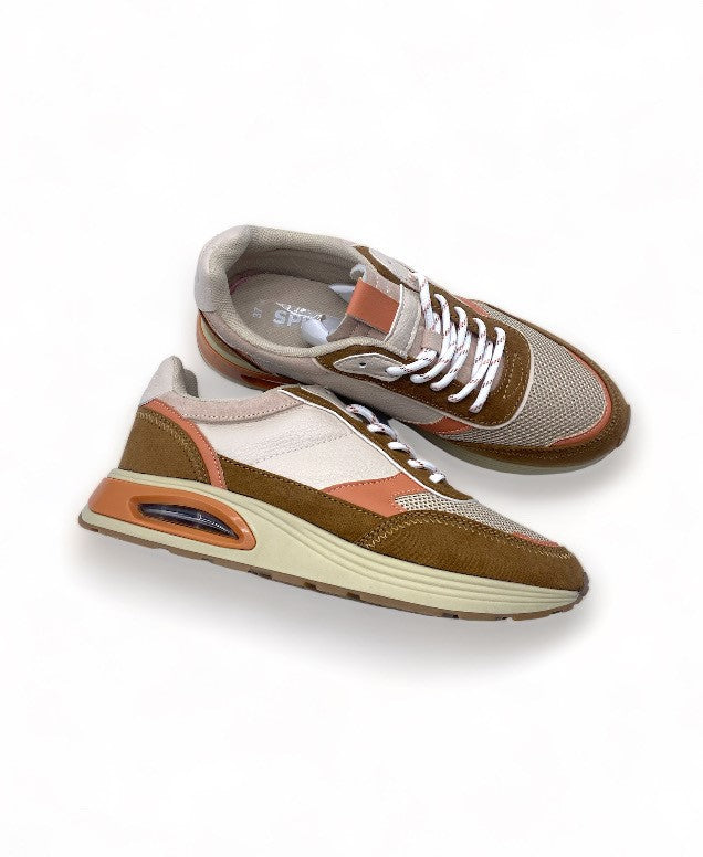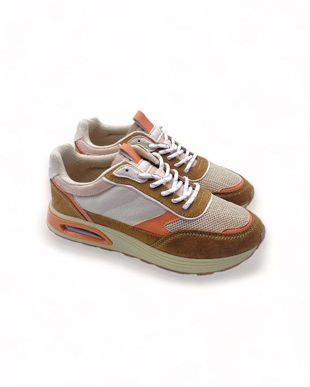 Ces chaussures pour femmes sont un mélange unique de style et de confort. Arborant une teinte principale bleue, elles intègrent des empiècements marron clair aux tons beige, créant un contraste élégant et moderne. Dotées de lacets élastiques blancs pour une touche de praticité et de style, ces baskets offrent un ajustement confortable et facile. Leur semelle blanche garantit un soutien optimal, tandis que la bulle d'air au contour orange offre un amorti supplémentaire, alliant ainsi mode et fonctionnalité. Ces chaussures polyvalentes sont idéales pour rehausser votre tenue décontractée ou sportive d'une touche d'originalité et de confort incomparable !