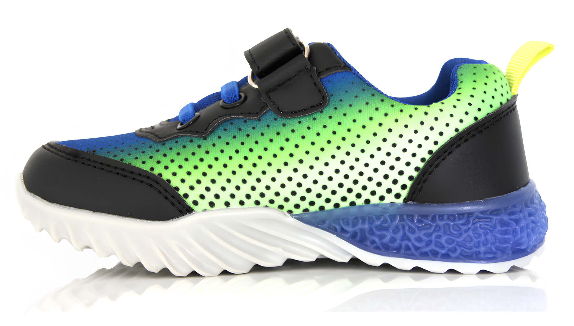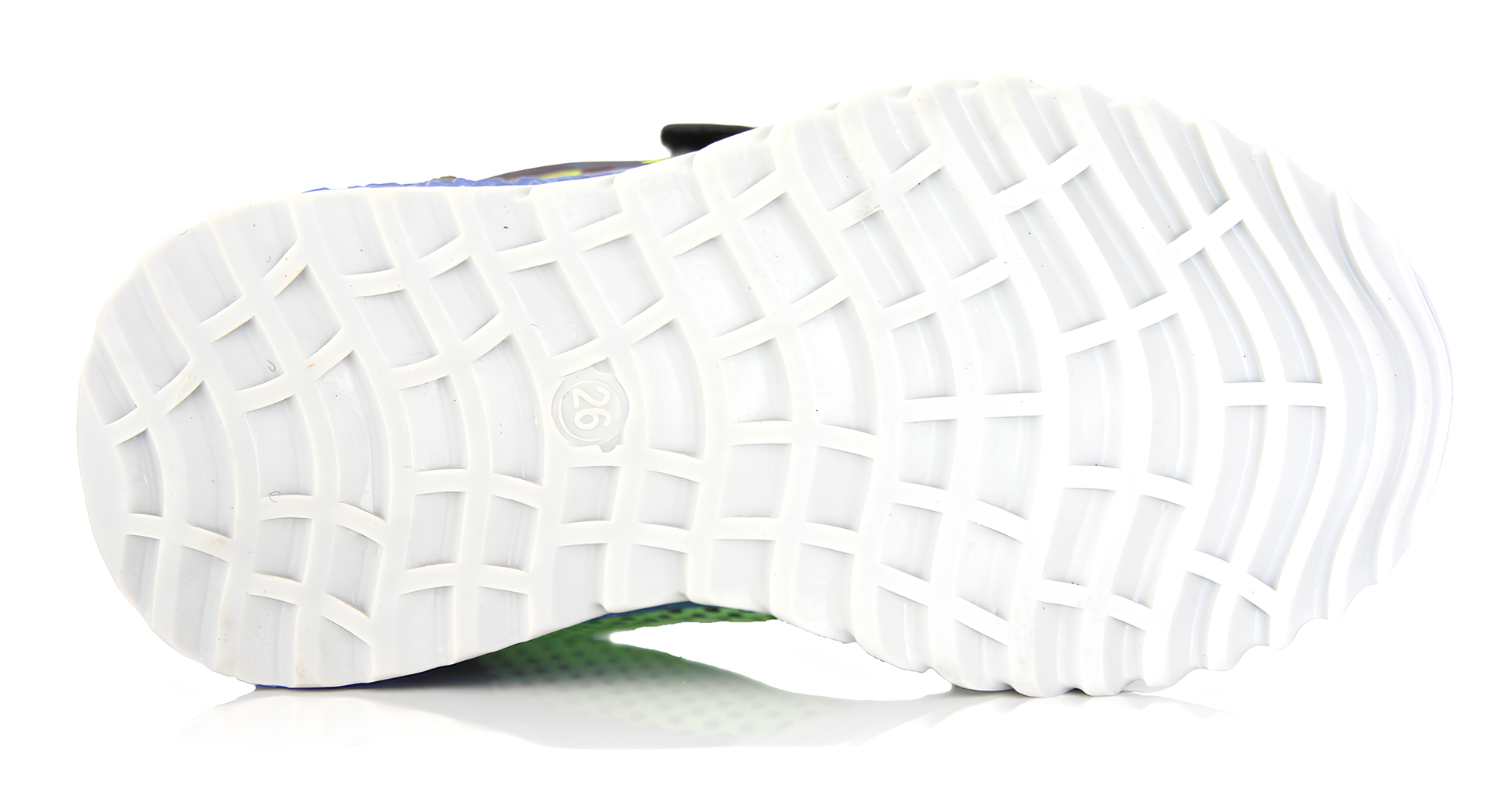 Le mélange de noir, bleu électrique et vert fluo, accompagné de détails jaunes, crée un look percutant. Le talon texturé bleu translucide ajoute une touche tendance, tandis que l’impression du héros emblématique en pleine action rend chaque pas encore plus amusant.