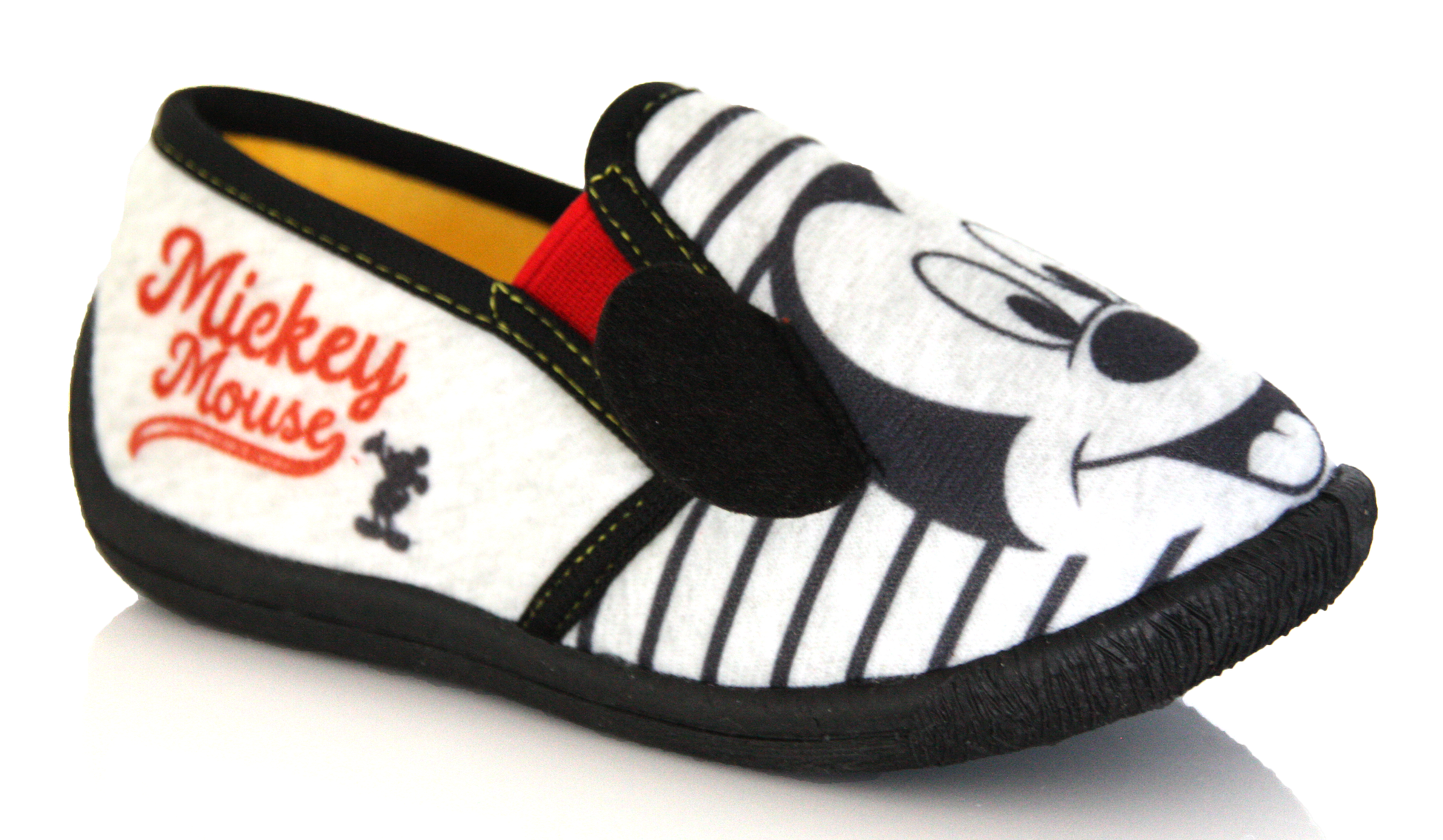 Ces pantoufles Mickey Mouse allient confort et design ludique. Avec leur bande élastique rouge et leur intérieur doux jaune, elles assurent chaleur et maintien. Le visage souriant de Mickey sur fond rayé noir et blanc apporte une touche amusante, tandis que la semelle noire antidérapante garantit sécurité et confort pour toutes les aventures à la maison.